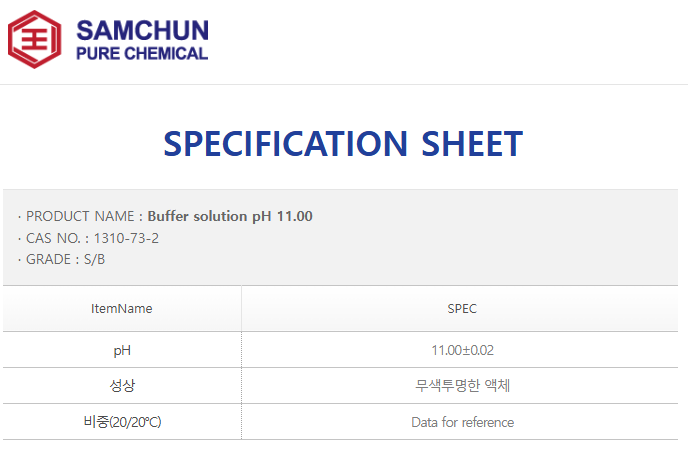 품명 실험실과 산업현장에서 pH 측정기의 교정 및 검증에 사용하는 표준 완충용액입니다. 안정된 완충 특성으로 pH 전극 교정, 품질관리 실험, 분석 장비 보정 등에 적합합니다. 무색투명한 액상 형태로 별도 희석 없이 바로 사용 가능하며, 각종 분석실·연구소·품질관리 공정에서 신뢰성 높은 pH 기준값을 제공합니다.