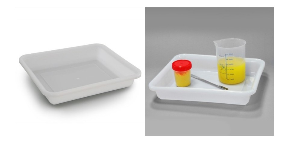 품명 위생 등급 PP 재질의 멸균 트레이. 재료 보관·혼합 시 깨끗한 작업 환경 유지에 적합하며, FDA·BSE free 기준 충족으로 안전성과 내화학성이 우수.