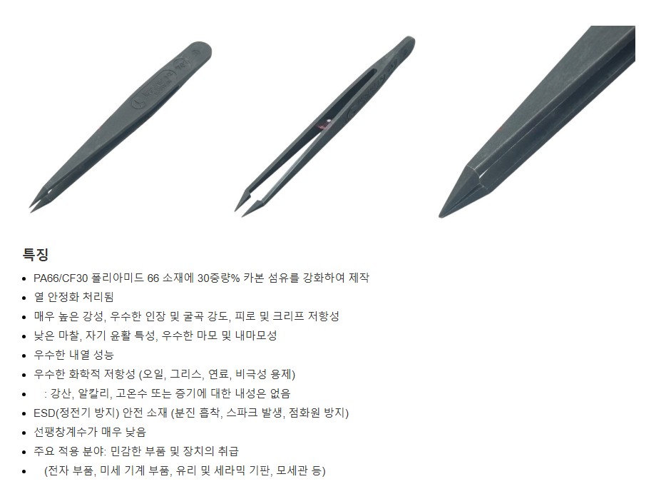 품명 707.CF 카본파이버 ESD 핀셋은 정전기 방지 기능과 높은 강성, 내열·내마모성을 가진 앵글형 정밀 핀셋으로 전자부품 및 실험기기 작업에 적합합니다.