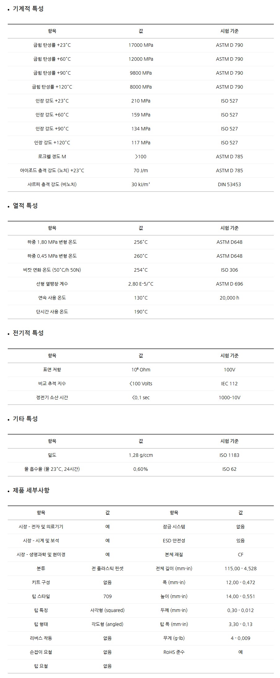 IDEAL-TEK 709.CF 핀셋은 30wt% 카본파이버가 강화된 PA66/CF30 플라스틱 소재로 제작된 정전기 방지(ESD Safe) 정밀 플랫 팁 핀셋입니다.
