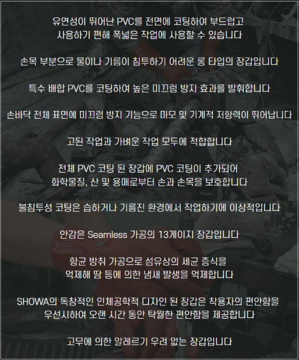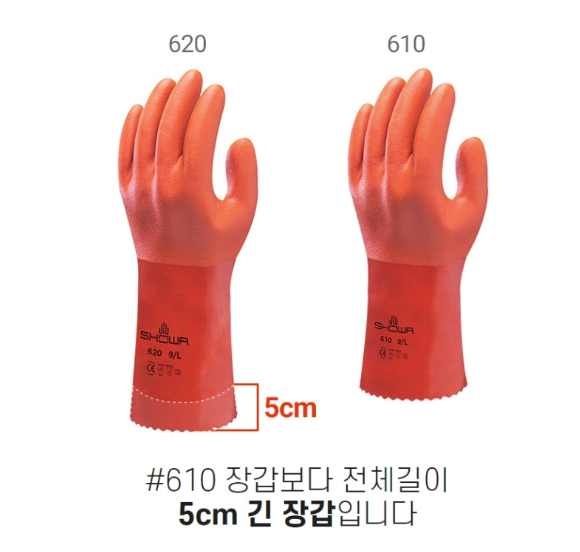 견고성과 유연성의 균형을 잘 맞추도록 설계된 쇼와 610의 긴 장갑 형태의 100% PVC 코팅 장갑