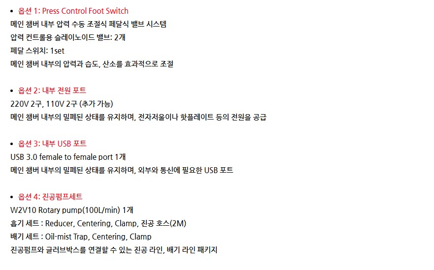 내부 전원 포트, USB 포트, 진공펌프세트 등 다양한 옵션을 지원하며, 연구 목적에 맞게 선택할 수 있습니다.