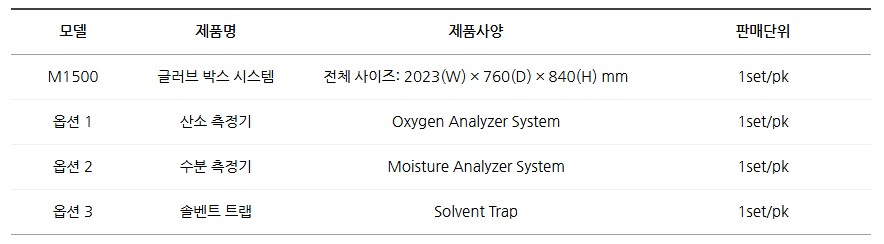 품명 M1500 글러브 박스 시스템, 진공펌프 세트 포함 고급형 1.5인용 모델. 산소·수분 측정기와 솔벤트 트랩 옵션 선택 가능, 연구소 및 산업 현장 최적 장비.