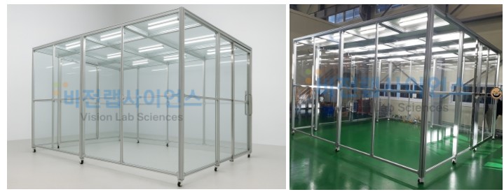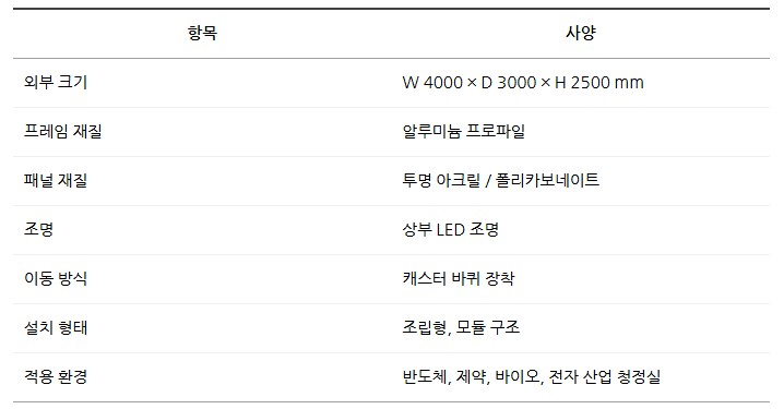 품명 알루미늄 프레임과 투명 패널로 제작된 클린부스, 내부 시야 확보와 이동식 구조로 반도체·제약·바이오 현장에 최적화된 청정 공간.