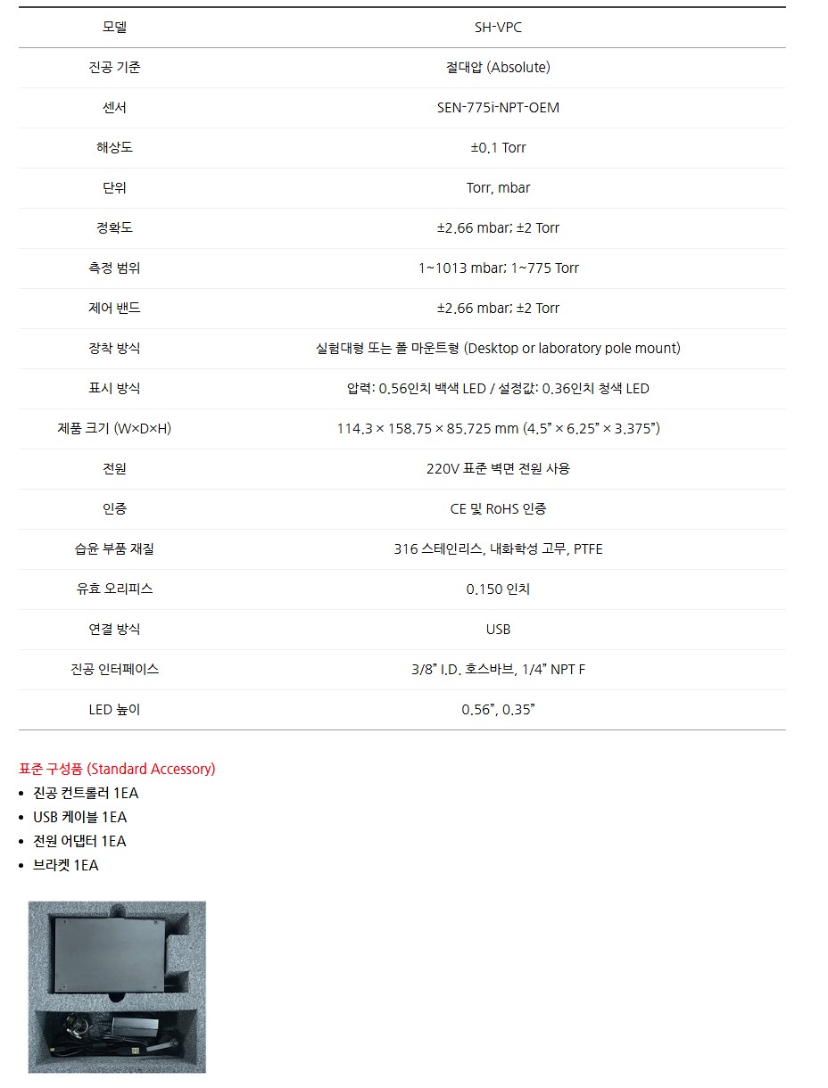 또한 Diaphragm, Oil Rotary, Dry Scroll 등 SH의 모든 진공펌프와 호환 가능하며, Software와 케이블이 기본 제공됩니다.