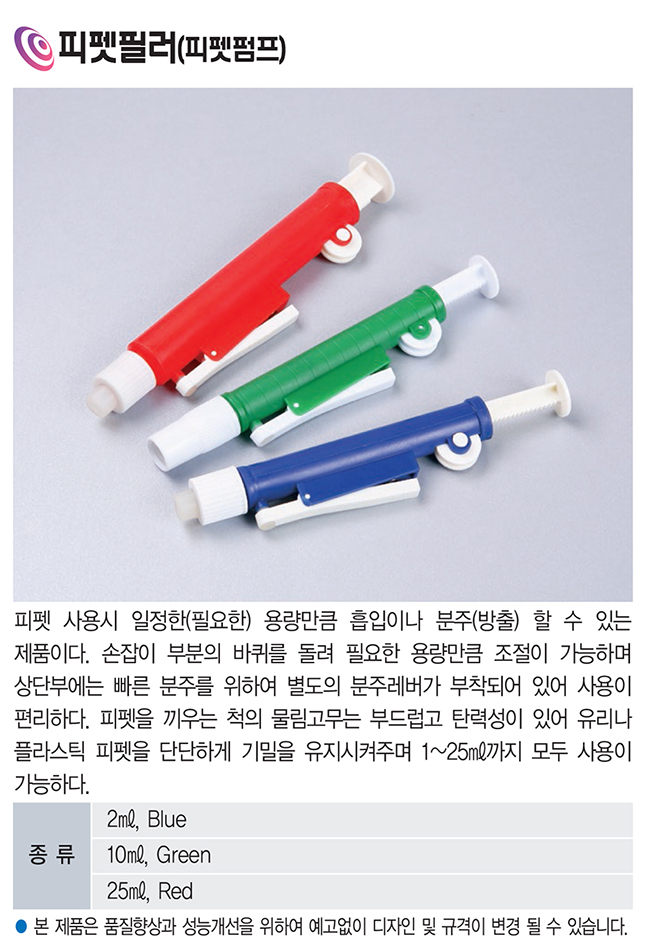 품명 피펫 사용시 일정한(필요한) 용량만큼 흡입이나 분주(방출)할 수 있는 제품이다. 손잡이 부분의 바퀴를 돌려 필요한 용량만큼 조절이 가능하며 상단부에는 빠른 분주를 위하여 별도의 분주레버가 부착되어 있어 사용이 편리하다. 피펫을 끼우는 척의 물림고무는 부드럽고 탄력성이 잇어 유리나 플라스틱 피펫을 단단하게 기밀을 유지시켜주며 1~25ml까지 모두 사용이 가능하다.