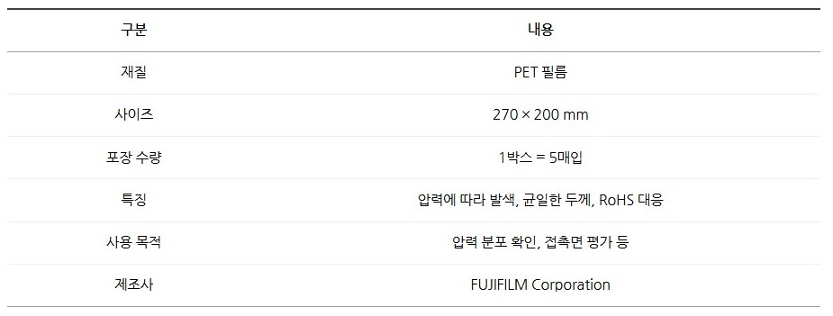 품명 초박형 PET 필름으로 제작된 FUJIFILM의 프리시트 압력측정필름은 다양한 압력 범위에 따라 6종류로 나뉘며, 압력을 가하면 붉게 발색되며 강도에 따라 색의 농도가 달라집니다.