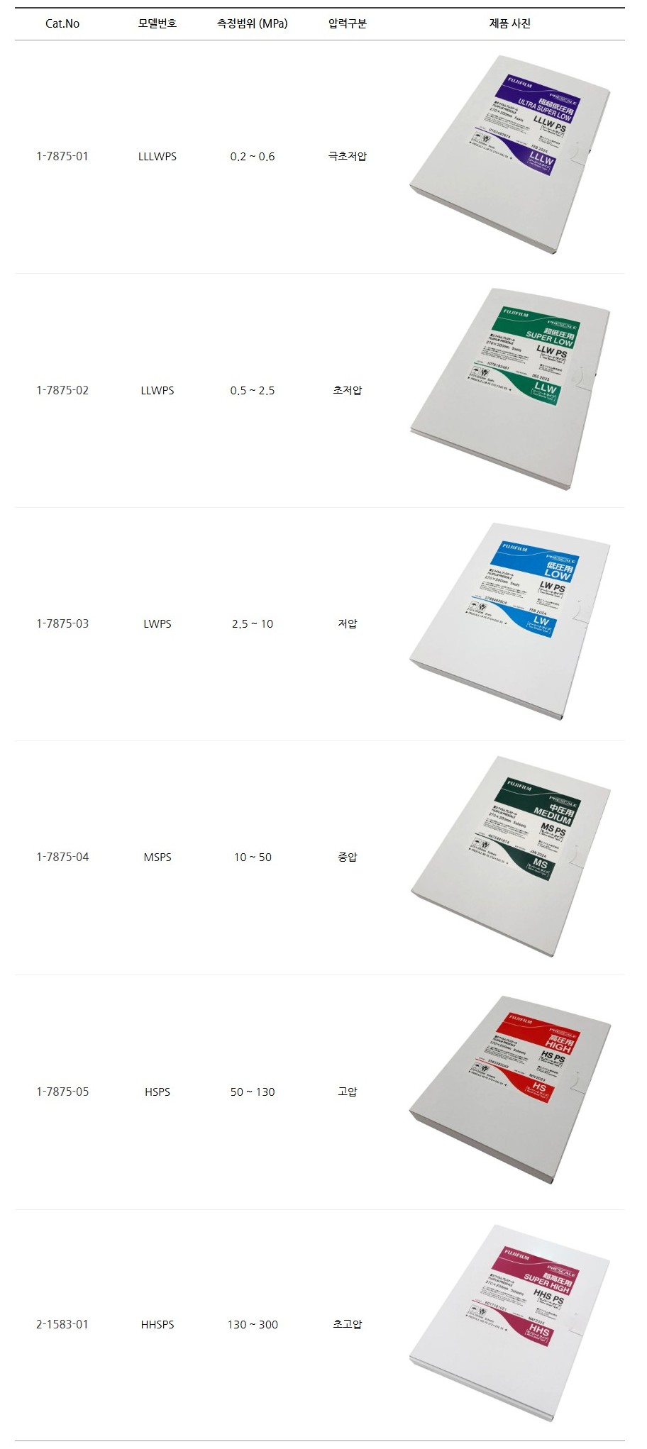 초박형 PET 필름으로 제작된 FUJIFILM의 프리시트 압력측정필름은 다양한 압력 범위에 따라 6종류로 나뉘며,
