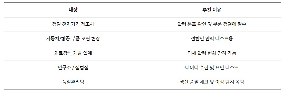 압력 분포 확인이 필요한 정밀기기 조립, 씰링 테스트 등에 널리 활용됩니다.
