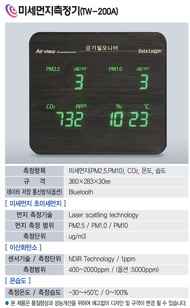 품명 TW-200A 미세먼지측정기는 PM2.5·PM10·CO2·온도·습도를 동시에 측정하는 공기질 모니터로, 레이저 센서와 NDIR 기술을 적용해 정밀한 실내환경 측정이 가능합니다.