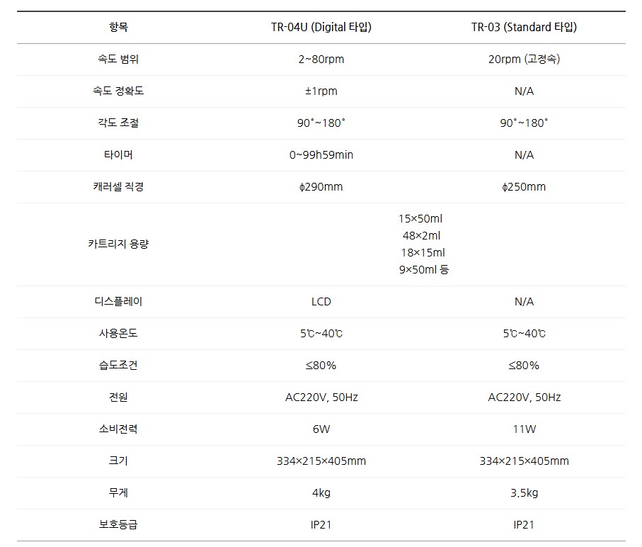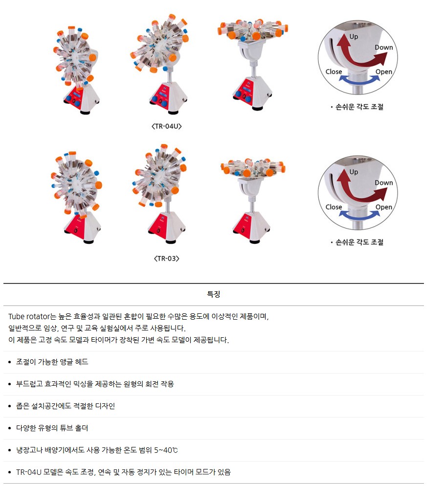 품명 디지털 튜브 로테이터 TR-04U는 2~80rpm 속도 조절, 90~180° 각도 조절, LCD 타이머 기능을 갖춘 실험실 혼합 장비입니다. TR-03 모델은 20rpm 고정속 기본형으로 경제적인 선택이 가능하며, 다양한 튜브 타입에 호환됩니다.