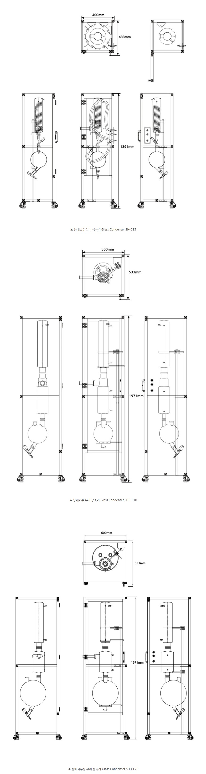 품명 SH-CE5, CE10, CE20 시리즈는 듀랄루민 프레임과 투명 PVC 세이프티 커버를 적용해 안전성과 내화학성이 뛰어나며, 용매 회수 및 진공 농축 공정에 최적화된 글라스 콘덴서입니다.