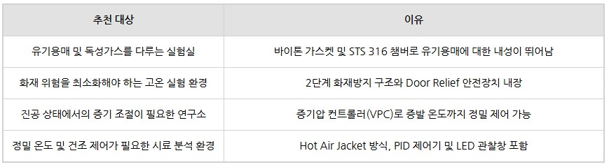 Hot Air Jacket 방식의 히터는 챔버 내부 직접 가열을 방지하고, 압력해제용 Door relief 시스템으로 폭발 위험을 최소화합니다.