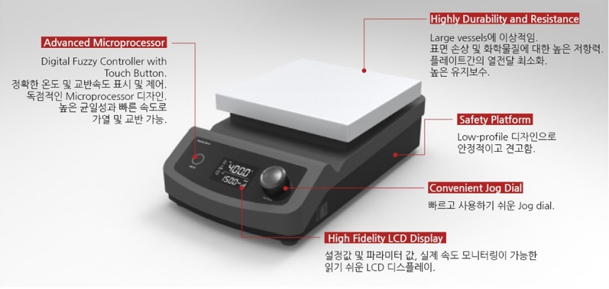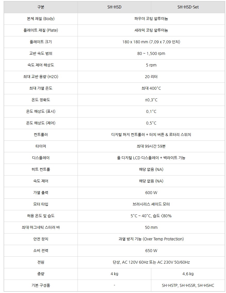 품명 정확한 온도·속도 제어! 디지털 핫플레이트 마그네틱 교반기 SH-HSD 시리즈. 고휘도 LCD와 안정적 설계로 실험 효율 UP.