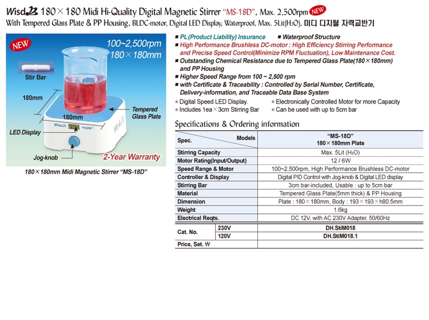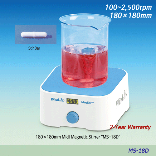 Wisd 180×180 Midi Hi-Quality Digital Magnetic Stirrer “MS-18D” , Max. 2,500rpmWith Tempered Glass Plate & PP Housing, BLDC-motor, Digital LED Display, Waterproof, Max. 5Lit(H 2 O), 미디 디지털 자력교반기
