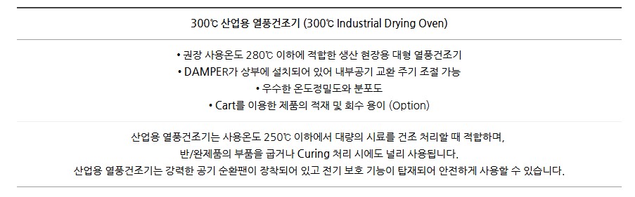 300℃ 산업용 열풍건조기 (SH-IDO 시리즈)는 고온 열처리, 건조, 경화 등 다양한 용도에 적합한 대형 열풍건조기입니다.