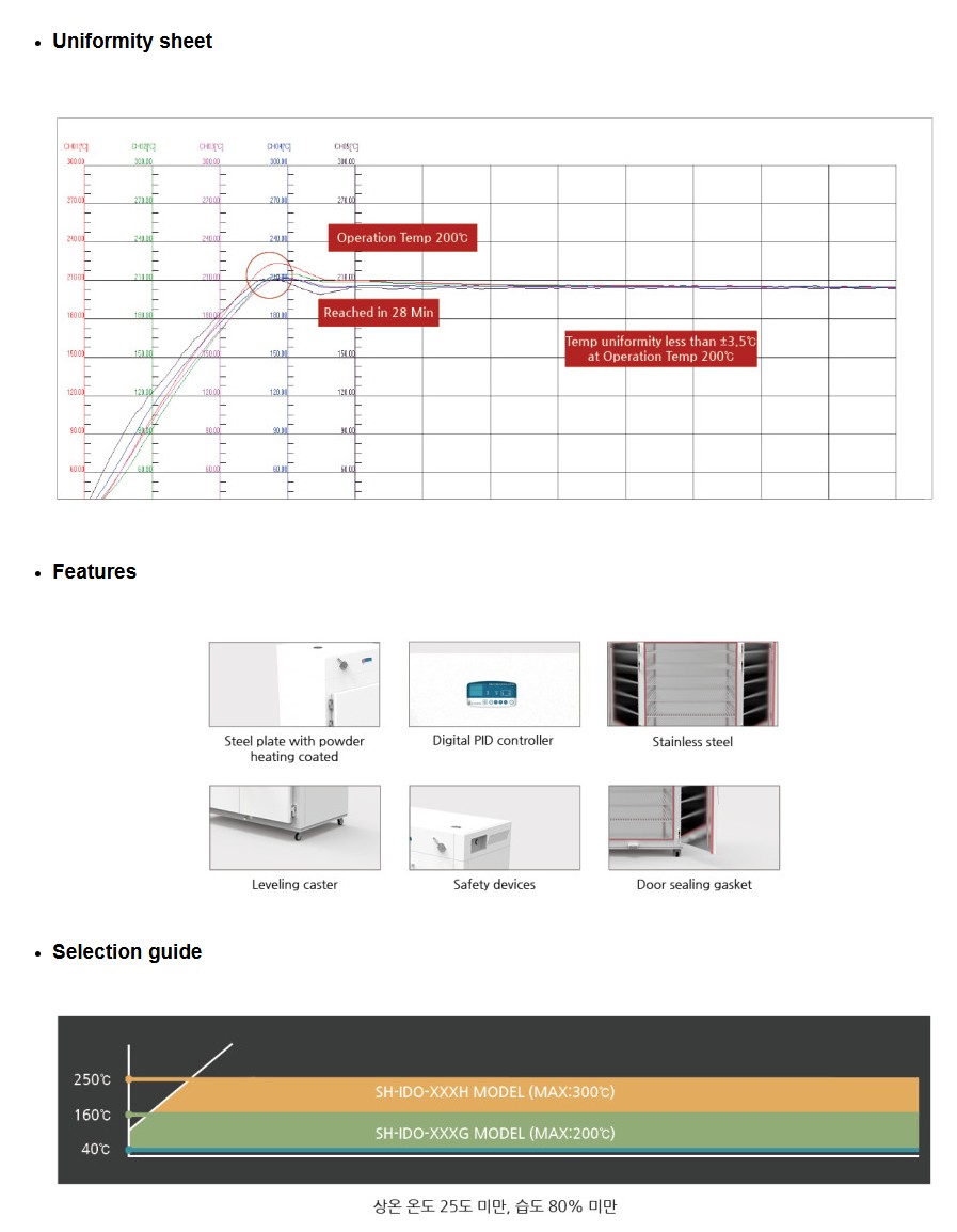 품명 300℃ 산업용 열풍건조기 SH-IDO 시리즈는 고온 건조, 경화에 최적화된 대형 오븐으로, 고효율 공기 순환과 정밀 온도 제어를 제공합니다.