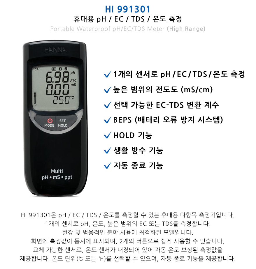 품명 pH·EC·TDS·온도를 하나의 센서로 측정하는 휴대용 다항목 수질측정기. 고범위 전도도 측정과 방수 설계로 현장 수질 관리에 최적화된 모델입니다.