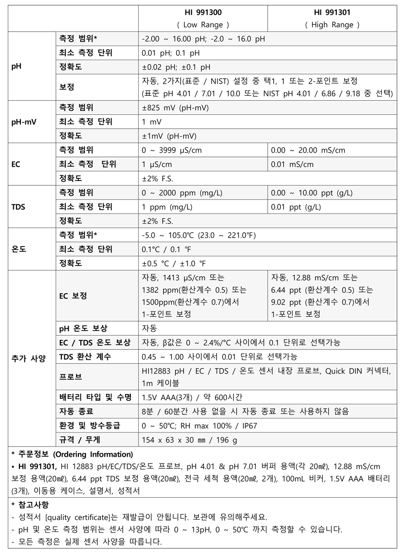 휴대용 다항목 수질측정기 온도 고범위 측정 휴대용 방수 수질테스터 고전도형 휴대용 수질계 HI 991301