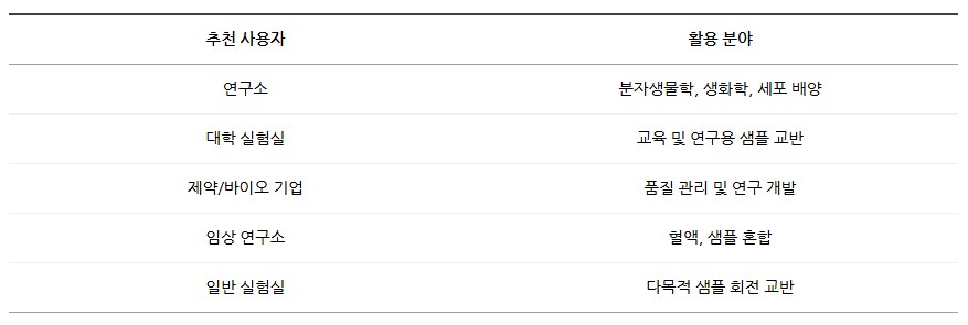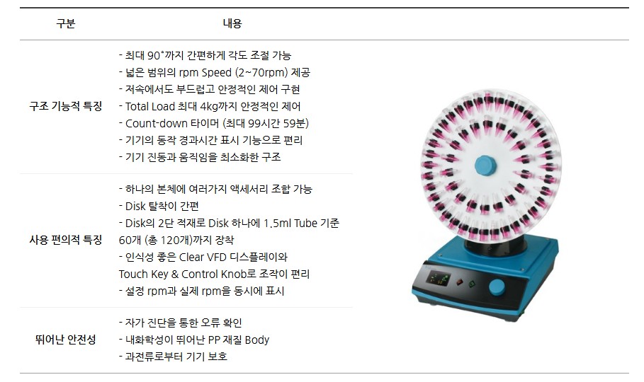 간편한 각도 조절 기능과 정밀한 속도 제어로 분자생물학, 세포 배양, 임상 연구 등 다양한 실험에 적합합니다.