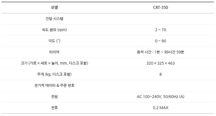 CRT-350 Rotator는 디스크형 2단 적재가 가능하여 다양한 튜브 크기를 동시에 장착할 수 있는 실험실용 장비입니다.