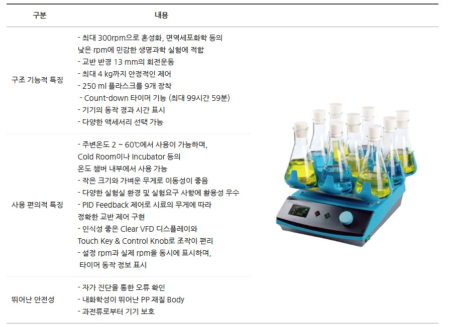 품명 소형·경량 디자인의 CMS-350 Mini Shaker. 50~300rpm 속도, 13mm 교반 반경, 타이머 기능 탑재로 세포배양 및 생명과학 실험에 최적화된 소형 진탕기.
