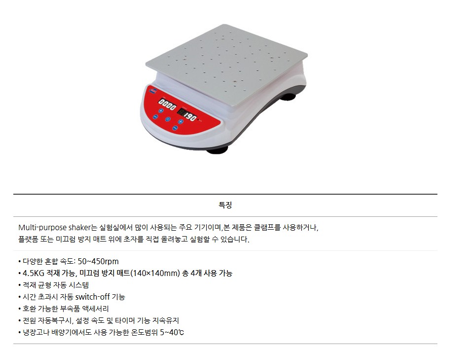 50~450rpm 속도 조절과 디지털 컨트롤러로 정밀한 진탕 실험이 가능합니다.