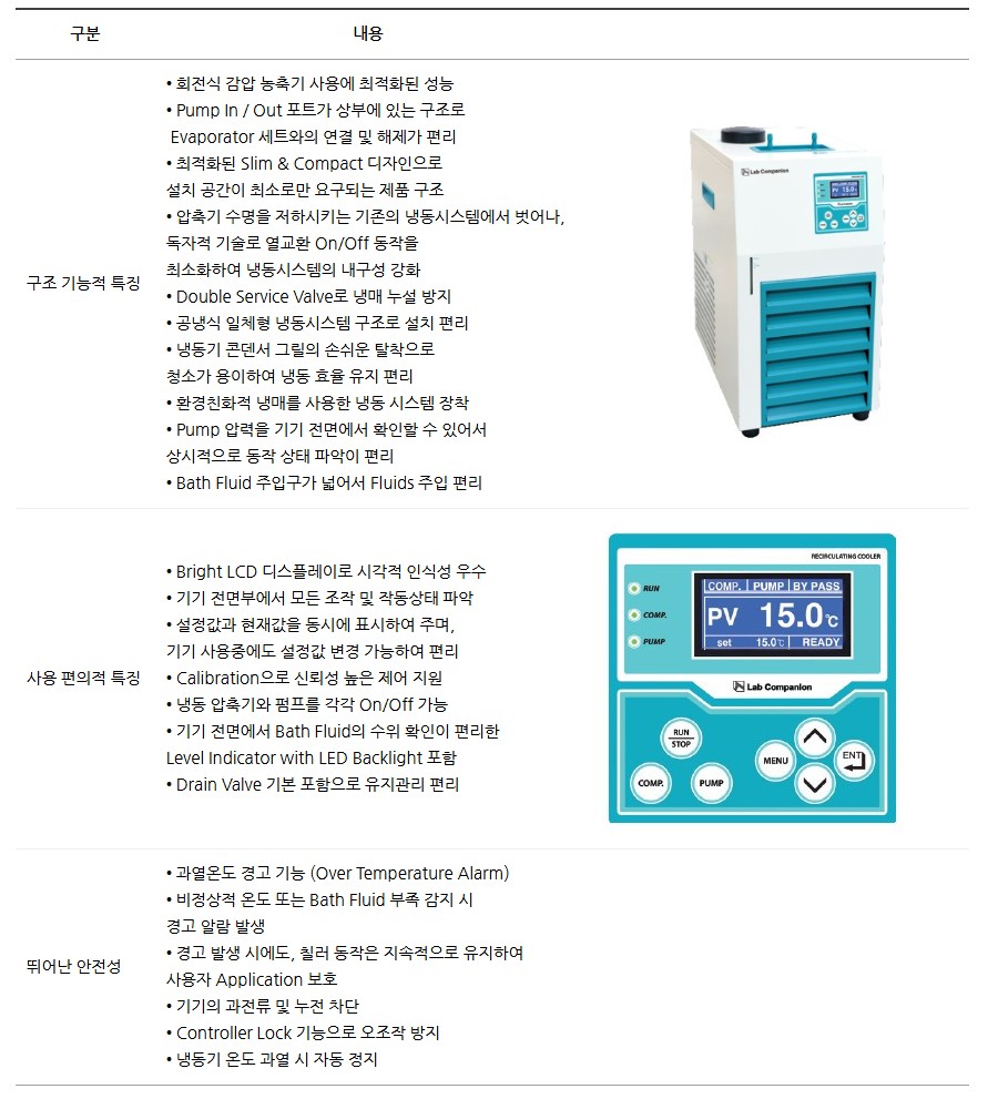 RC-05 모델은 -20℃에서 +30℃까지 정밀하게 온도 제어가 가능한 냉각수 공급장치입니다.