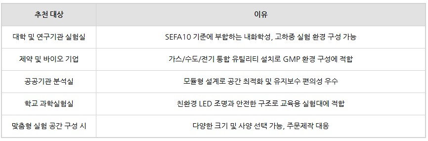 모듈형 구조로 설치 및 재설치가 용이하며, 다양한 실험 환경에 맞게 상부 선반형, 시약장형, 코너형 등으로 선택할 수 있습니다.