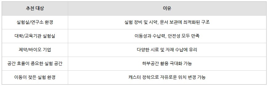 실험대 아래 또는 공간 제약이 있는 구역에서도 자유롭게 배치 가능하며, 바퀴가 장착되어 있어 필요에 따라 손쉽게 이동할 수 있습니다.