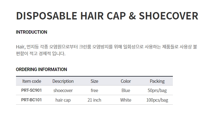 Hair 먼지등 각종 오염원으로부터 크린룸 오염방지를 위해 일회성으로 사용하는 제품들로 사용상 불편함이 적고 경제적 입니다.
