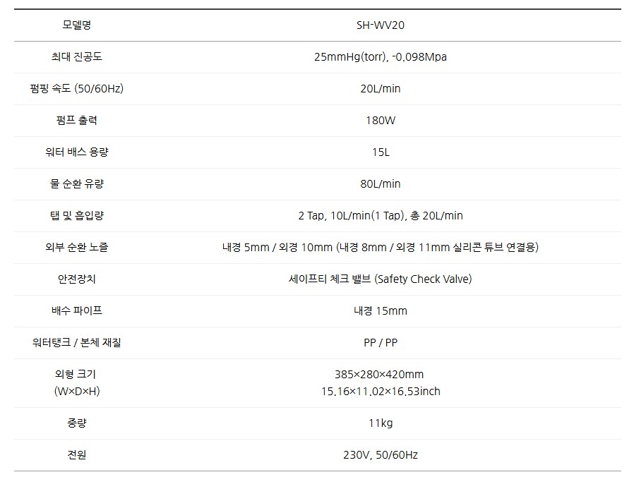 산, 알카리, 유기용매 등 부식성 물질에 강한 워터젯 진공 펌프 SH-WV20은 내식성 재질로 제작되어 실험실 및 화학 공정에 적합합니다.