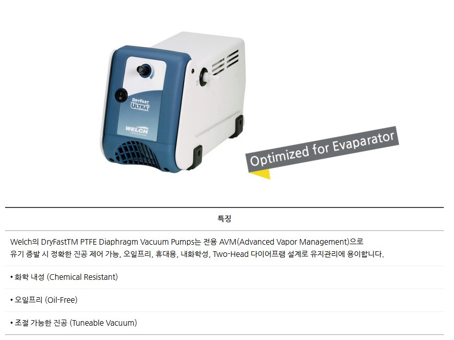 웰치(Welch)의 DryFast™ PTFE Diaphragm Vacuum Pump는 Advanced Vapor Management(AVM) 기술을 적용하여,