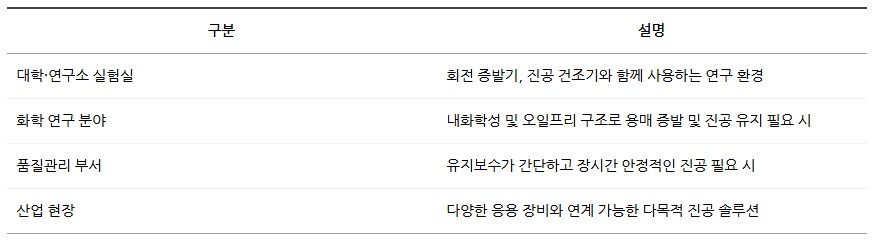 연구소, 실험실, 산업 현장 등에서 진공 건조기 및 회전 증발기와 함께 사용하기 적합합니다.