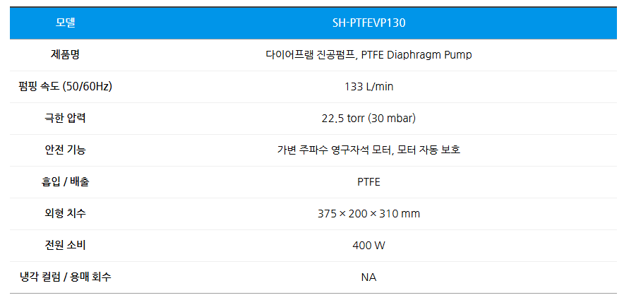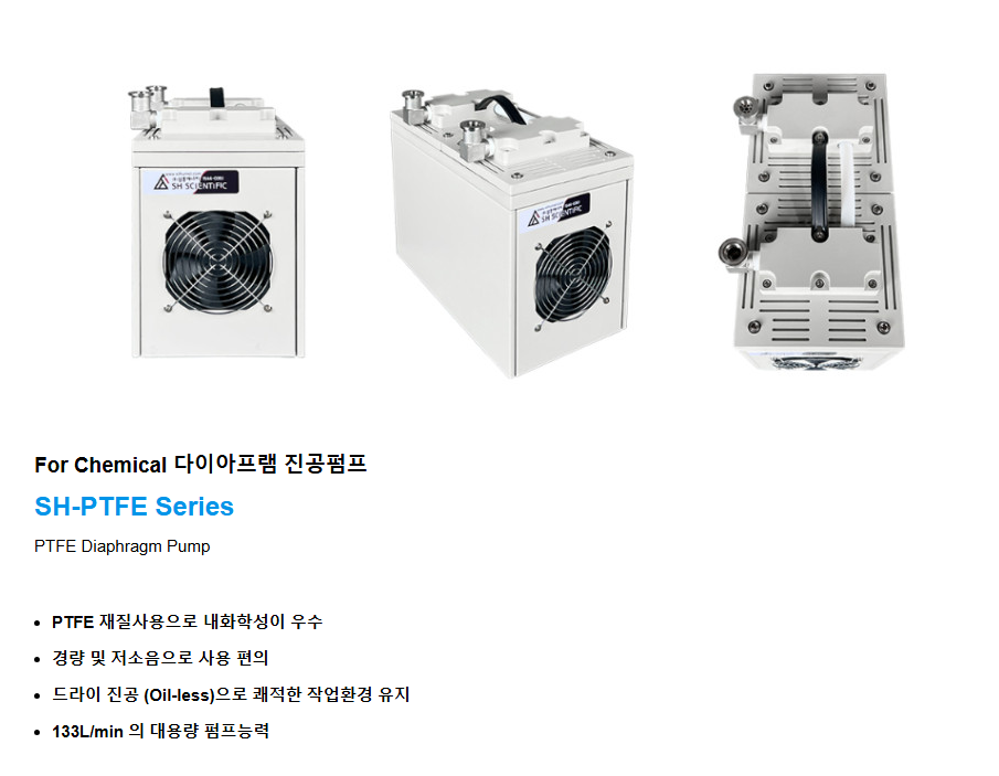 품명 SH-PTFEVP130 PTFE 다이어프램 진공펌프는 내화학성이 뛰어난 오일리스 구조와 133L/min 대용량 성능을 갖춘 화학·실험실용 진공 펌프입니다.