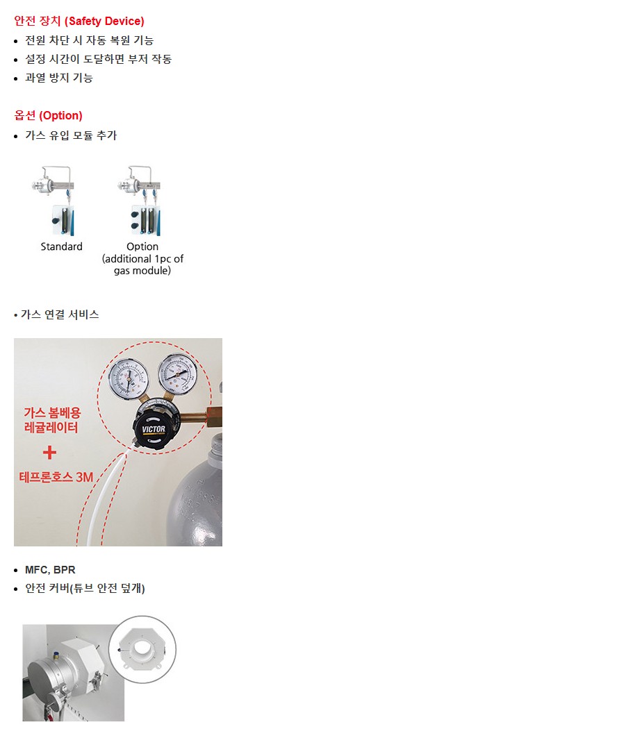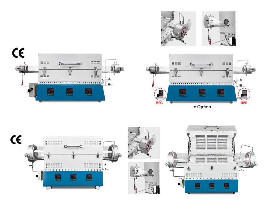 각 모델은 가열로(Furnace), 가스 유량계, 스테인리스 배관·커넥터, 가스 실링 마스크, 석영관(Quartz Tube)을