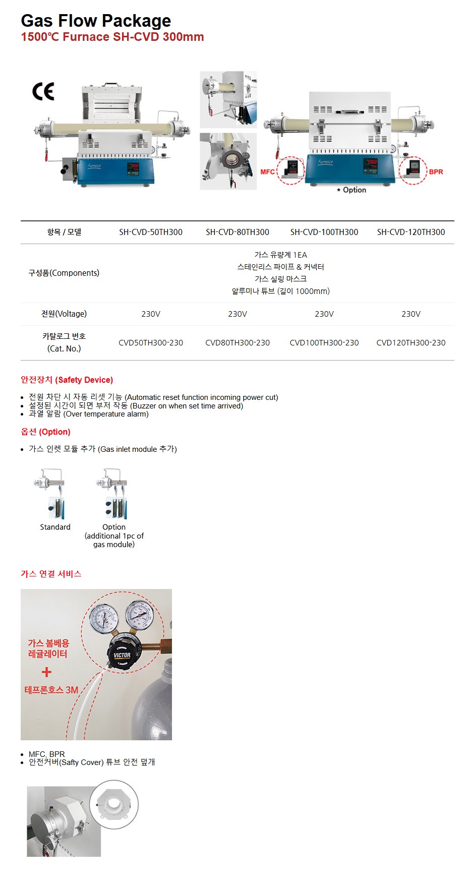 품명 전원 차단 시 자동 리셋, 과열 알람 기능 탑재. 가스 인렛 모듈 추가 가능하며, 레귤레이터와 테프론호스 포함 안전한 가스 연결 서비스 제공.