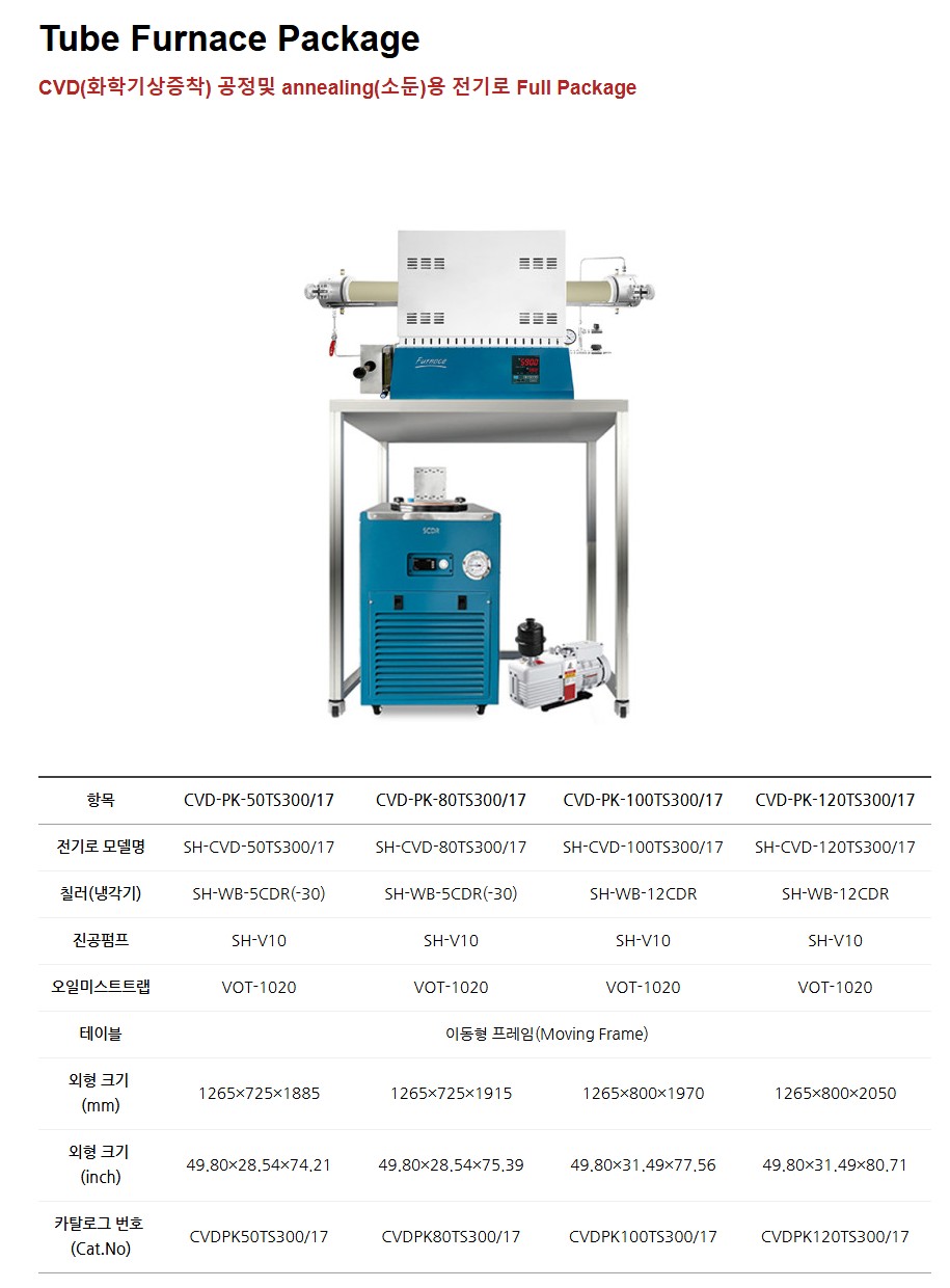 품명 1700℃ 튜브전기로 패키지(CVD·Annealing) 300mm는 SH-CVD 시리즈 전기로를 기반으로 진공펌프·칠러·오일미스트트랩을 포함한 고온 열처리 세트로, 반도체·소재 연구용 고정밀 퍼니스 시스템입니다.