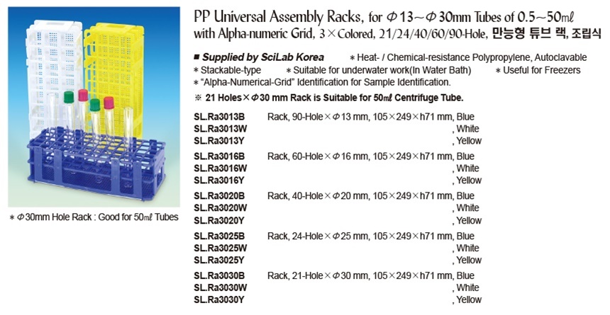 PP Universal Assembly Racks, for Φ13~Φ30mm Tubes of 0.5~50㎖ with Alpha-numeric Grid, 3×Colored, 21/24/40/60/90-Hole, 만능형 튜브 랙, 조립식