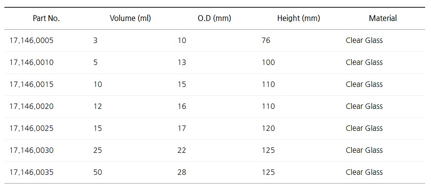 투명 유리 재질로 제작되어 시약 반응, 혈청 분리, 미립자 분석 등 다양한 연구 실험에 적합하며 내화학성이 우수해 반복 사용이 가능합니다.