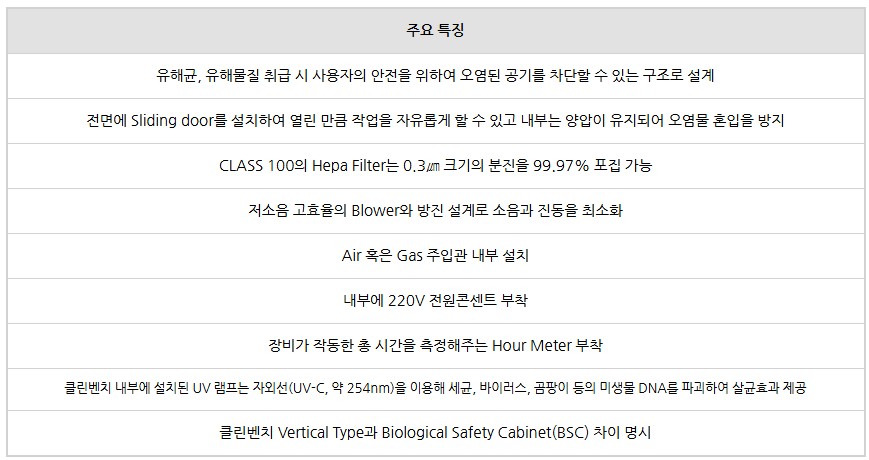 품명 HEPA 필터 장착 무균작업대! 슬라이딩 도어, UV램프, Hour Meter 포함 수직기류형 Clean Bench 시리즈