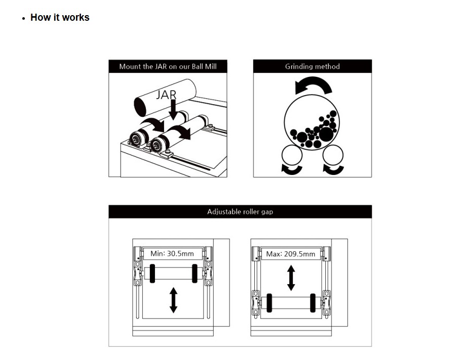 볼(세라믹/스틸)과 Jar 또는 Bottle을 회전시켜 분쇄하며,