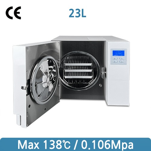 품명 SH-AC-18N/23N 탁상형 증기압 멸균기, 18L·23L 용량 선택 가능. LCD 컨트롤러와 스테인리스 구조로 연구실·교육기관 멸균에 적합.