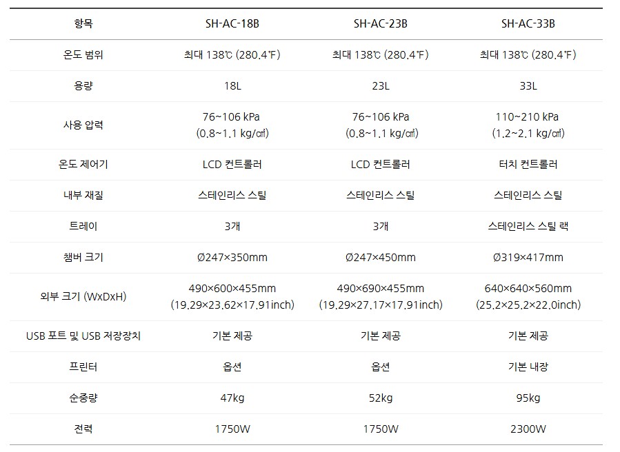 품명 SH-AC 시리즈 탁상형 증기압 멸균기, 18L·23L·33L 용량 선택 가능. LCD/터치 컨트롤러와 스테인리스 구조로 연구실 멸균 작업에 적합.