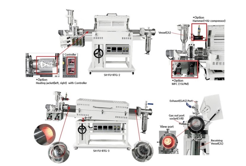 품명 1200도 2존 회전식 로터리 킬른 SH-FU-120RKG600, 정밀 온도제어 및 다양한 가스 포트 구성으로 실험실에 최적화된 장비입니다.
