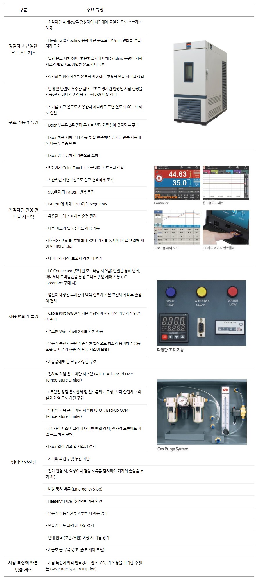 또한 고온·저온 보호 시스템, 전자식 과열 차단장치, 가스 퍼지 시스템 등 안전성과 확장성까지 고려된 고급 환경 시험기입니다.