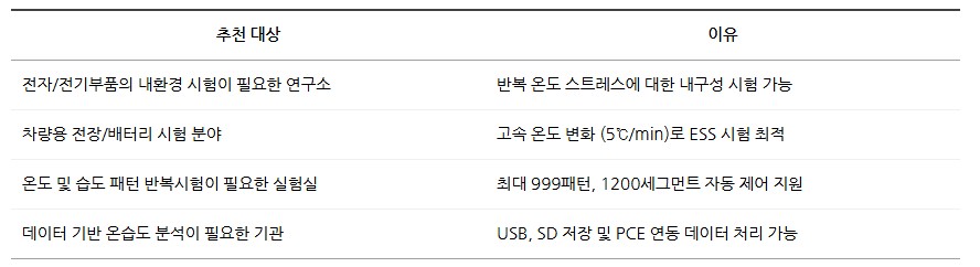 정밀 PID 제어 및 5.7인치 컬러 터치 패널이 탑재되어 패턴 시험, 실시간 모니터링, 데이터 저장까지 손쉽게 수행할 수 있습니다.