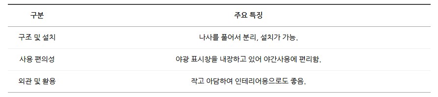 야광 표시창이 있어 야간에도 쉽게 사용할 수 있으며, 인테리어용으로도 적합한 작고 세련된 디자인이 특징입니다.