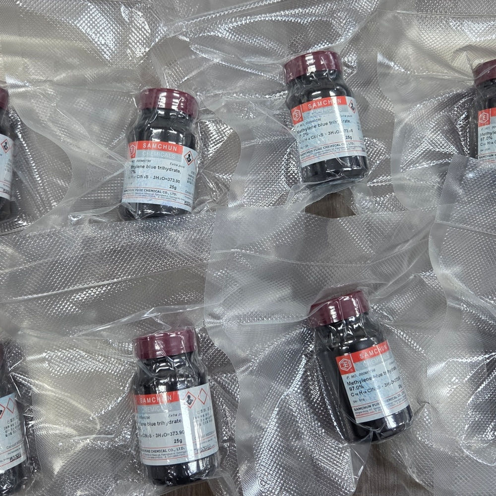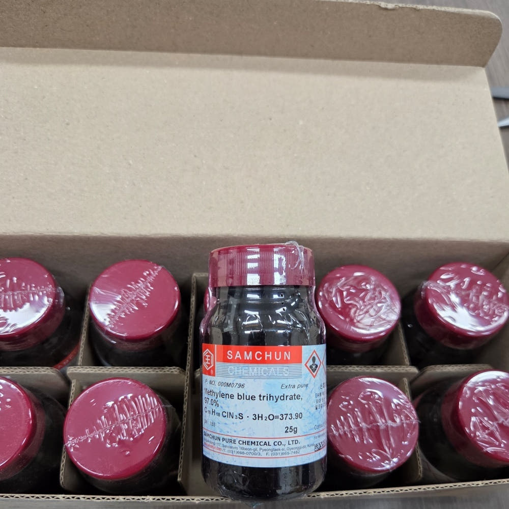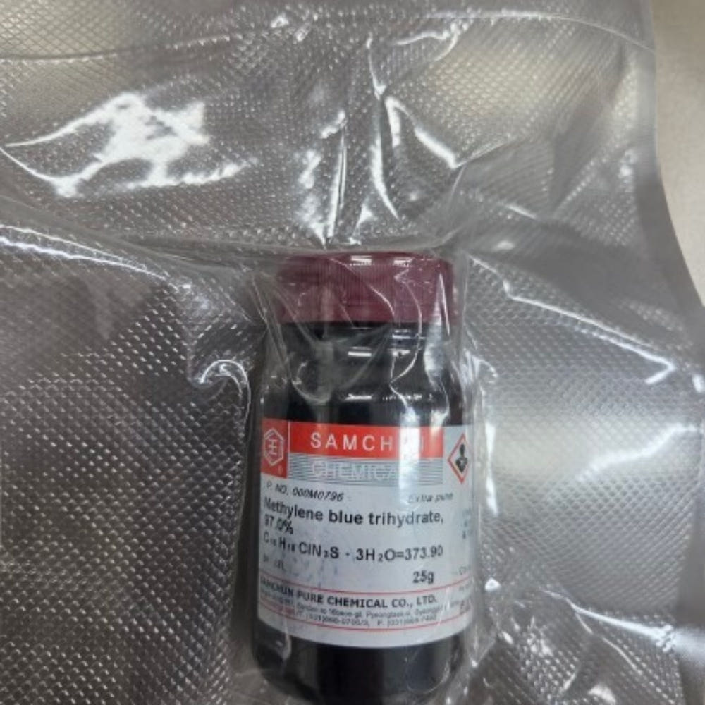 품명 메틸렌블루 97% EP 25g 분말 시약. 실험실·연구소 연구용 고순도 시약으로 다양한 분석 및 실험에 활용 가능.
