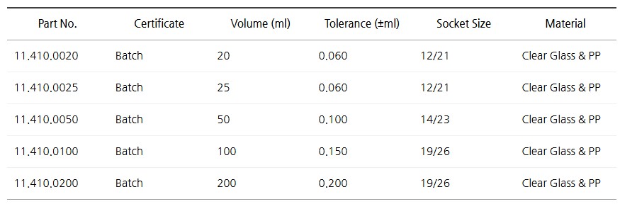 ISO/DIN 1042 Class A 규격을 준수하며, 20℃에서 교정되었습니다.